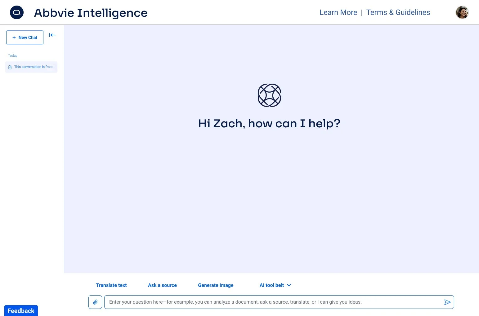 AbbVie AI - a proprietary tool designed to provide internal users with ChatGPT-like capabilities - had become fragmented and confusing. Users were presented with five disjointed tools: Chat, Analyze, Translate, Ask a Source, and GO/AI. The interface suffered from unclear IA, high cognitive load, and lack of persistent conversation history.