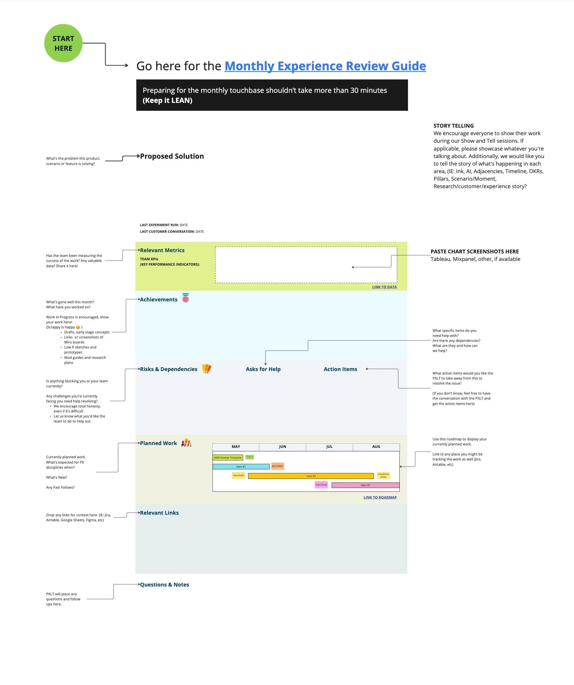 I launched and facilitated the Monthly Experience Review, a company-wide design meeting attended by senior PX leadership. I built the structure, recruited presenters, coordinated panel feedback, and ensured each session was documented and actionable. Presentations were framed around product goals, user insights, and experience quality, creating a shared language between individual contributors and leaders. I made certain to keep the feedback high level and to keep the leaders from getting into the weeds by moderating these conversations and making sure to set expectations ahead of time for both individual contributors and leaders